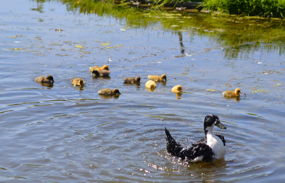 In de vijver zwemmen allerlei eendensoorten. Het is lastig om in SKIK eenden te houden omdat ze vrij toegang hebben tot de sloot. Inmiddels loopt er een gevarieerd koppeltje rond in verschillende maten en kleuren. Er lopen ook een aantal parmantige loopeenden rond. Dit koppeltje wordt dit jaar (2015) uitgebreid door zelf wat eieren in onze broedmachine uit te broeden van dit bijzondere eendensoort.  Ganzen hebben we zo nu en dan. Soms broeden we wat eieren uit of krijgen tamme ganzen. Maar…tamme ganzen blijken na enige tijd in SKIK toch weer hun natuurlijke gedrag terug te krijgen als zij zich heer en meester voelen op de weide. Het is dan voor het publiek wat minder leuk. Ook vliegen de ganzen als het kouder wordt spontaan naar warmere streken en zijn we ze zomaar kwijt.